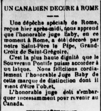 En 1888 le juge Baby se trouvait à Rome, chargé d’une mission très délicate auprès du Saint-Siège, pour le règlement de l’attribution des biens des jésuites devant être consacrés à l’éducation. Il a obtenu que la succursale de l’Université Laval à Montréal obtienne son autonomie de celle de Québec. On comprend son attachement à cette institution qu’il a contribué à établir. Lors de son voyage le Pape Léon XIII lui a remis la décoration de Grand-Croix de Saint-Grégoire.