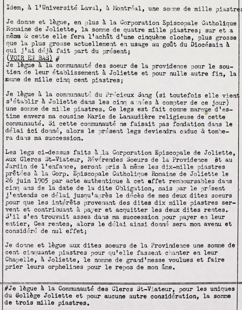 Il a ensuite fait des legs à ses filleuls, à des amis, à des chanoines de la cathédrale de Montréal, aux petites soeurs des pauvres, aux soeurs du Saint-Esprit, aux soeurs de la Providence de Montréal, 1.000 piastres à l’université Laval de Montréal. À la Corporation Épiscopale de Joliette 4.000 piastres dont une partie devra servir à acheter une 5ème cloche pour la cathédrale, plus grosse que les autres. Suivent des legs importants à des communautés religieuses établies à Joliette. 1.500 piastres aux soeurs de la Providence, 1.000 à la communauté du Précieux Sang, 3.000 aux clercs de St-Viateur.