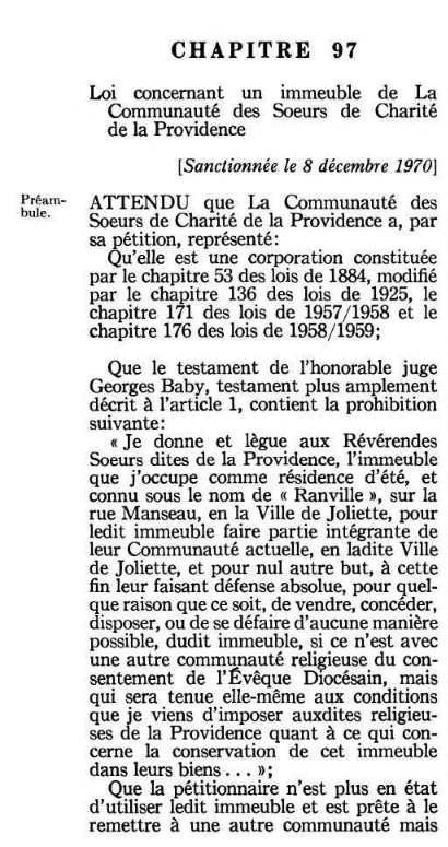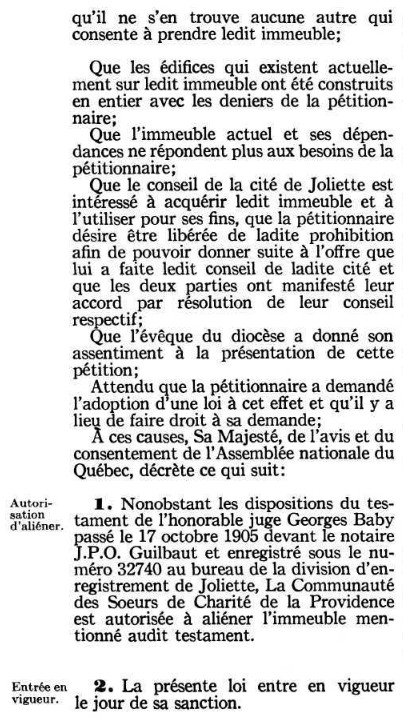 En 1906 les Soeurs de Charité de la Providence avaient reçu en donation la maison du juge Baby sur la rue Manseau connue sous le nom de Ranville avec défense de la vendre ou d’en disposer. Une loi a dû être adoptée en 1970 par l’Assemblée Nationale pour autoriser la vente de l’immeuble à la ville de Joliette qui a transformé l’ancienne école en Hôtel de Ville.