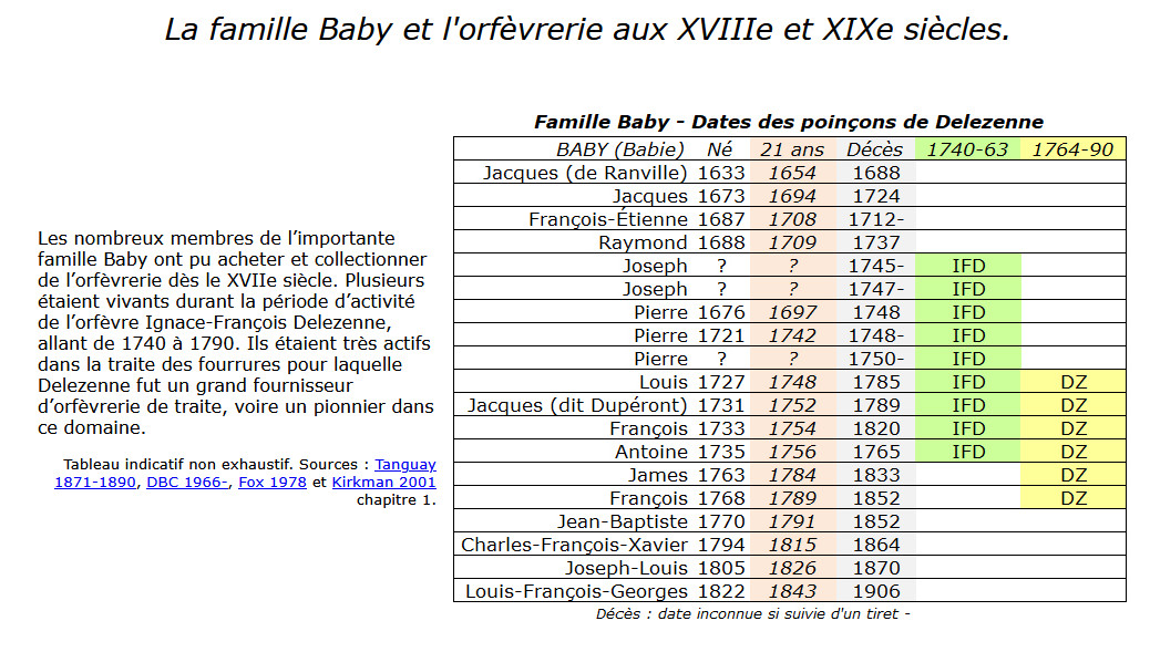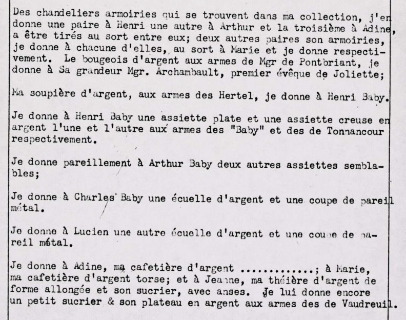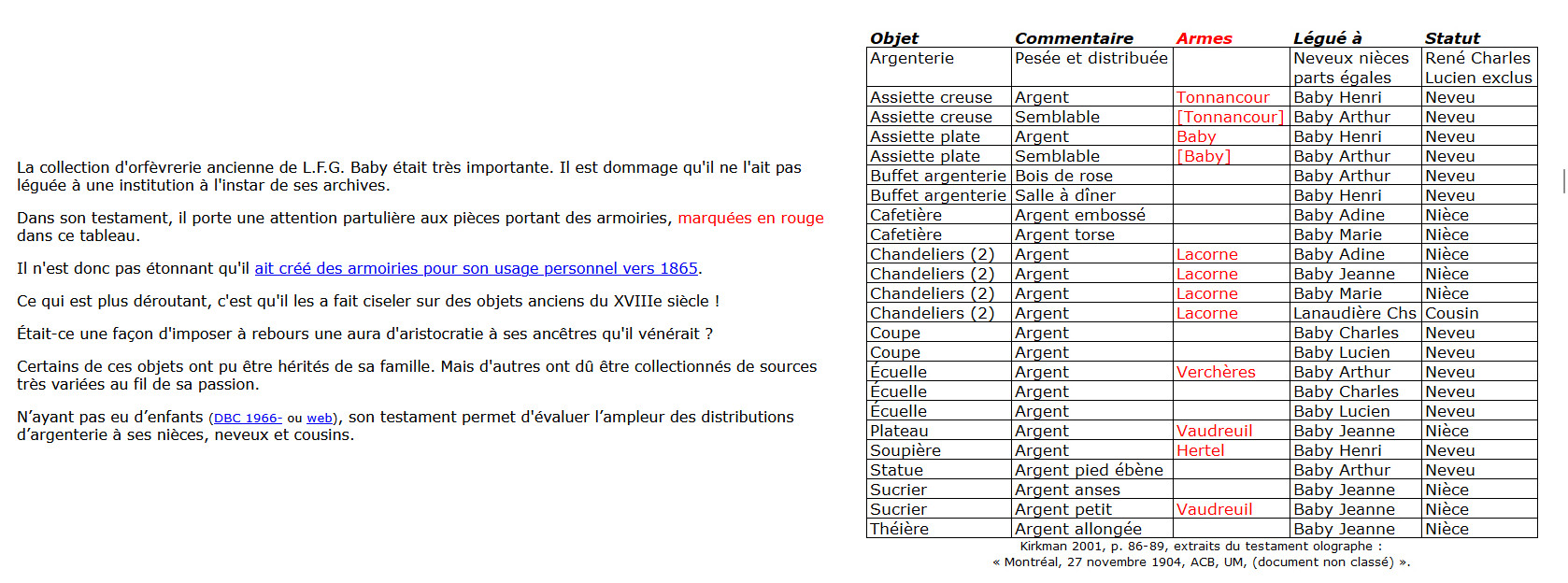 La famille Baby avait été très importante dans la traite de fourrures et avait placé une partie de ses bénéfices dans des pièces d’argenterie. Georges Baby avait légué les pièces les plus précieuses de son argenterie à des membres précis de sa famille. Elles sont détaillées dans ce tableau.
