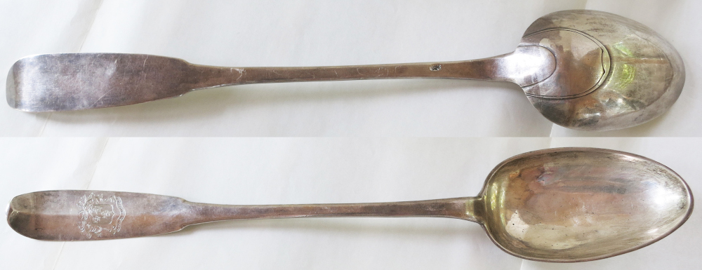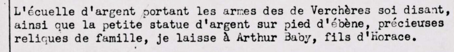 Seules les pièces d’importance sont mentionnées dans ce testament, cette cuiller à servir échappant donc à cette nomenclature. Portant les armoiries des Baby qu’il y avait fait graver, elle se trouvait parmi les autres ustensiles dans l’un ou l’autre de ces précieux meubles, le grand buffet contenant une partie de mon argenterie dans la salle à dîner et l’autre en bois de rose qui enferme l’autre partie de mon argenterie, ou avec toute mon argenterie, d’une valeur réelle, [qui] sera pesée et distribuée entre mes neveux et nièces (René, Charles et Lucien exclus) par égales parts.