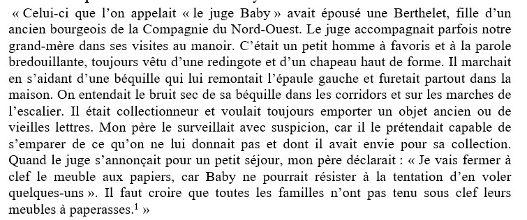 Robert de Roquebrune dans Testament de mon enfance raconte que quand Georges Baby venait rendre visite à sa famille au manoir de L’Assomption son père serrait ses documents historiques familiaux sous clef pour ne pas se les faire voler par le juge Baby.