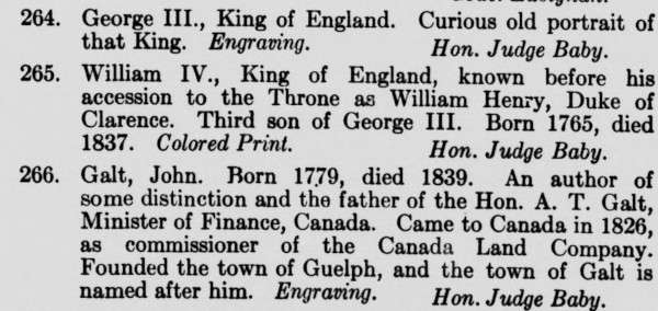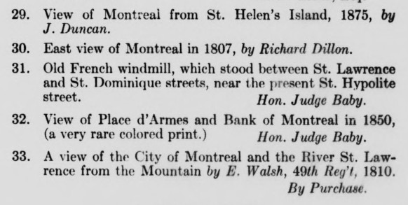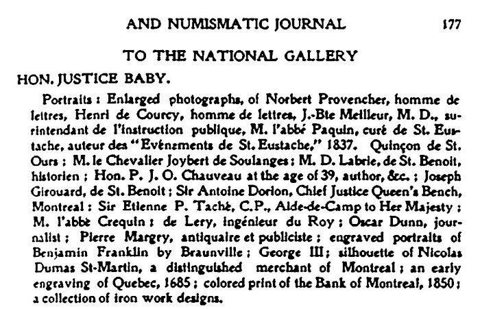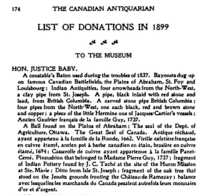 Dans le Catalogue of the Château de Ramezay museum and portrait gallery publié en 1912 on trouve de très nombreuses pièces données par l’Hon. Judge Baby.