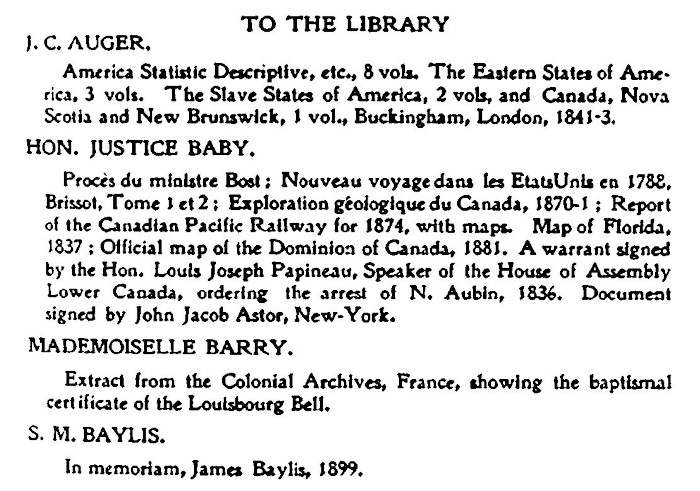 Chaque année, le Canadian Antiquarian and Numismatic Journal publie la liste des objets acquis par donation par le Musée du Château Ramezay accompagné du nom des donateurs. La liste se compose de trois sections : les dons faits au musée, les dons faits à la bibliothèque et les dons faits à la Galerie nationale. Pour chacune des sections, le Juge Baby est sans contredit le donateur le plus généreux.