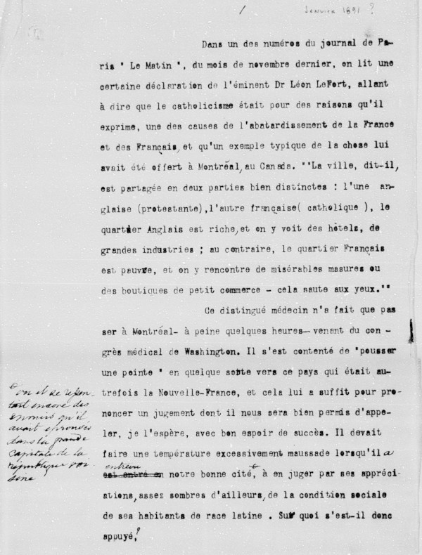 Dans les documents numérisés par la BANQ se trouve une lettre manuscrite de madame Marbeau, 1 place d’Iéna à Paris, demandant au juge Baby de réfuter un article intitulé «Catholiques canadiens inférieurs à leurs compatriotes protestants», paru dans le journal Le Matin à Paris en novembre 1890. Georges Baby a dactylographié une longue réponse au docteur Léon Lefort qu’il a fait publier sous le nom de M. de Ranville en 1891.