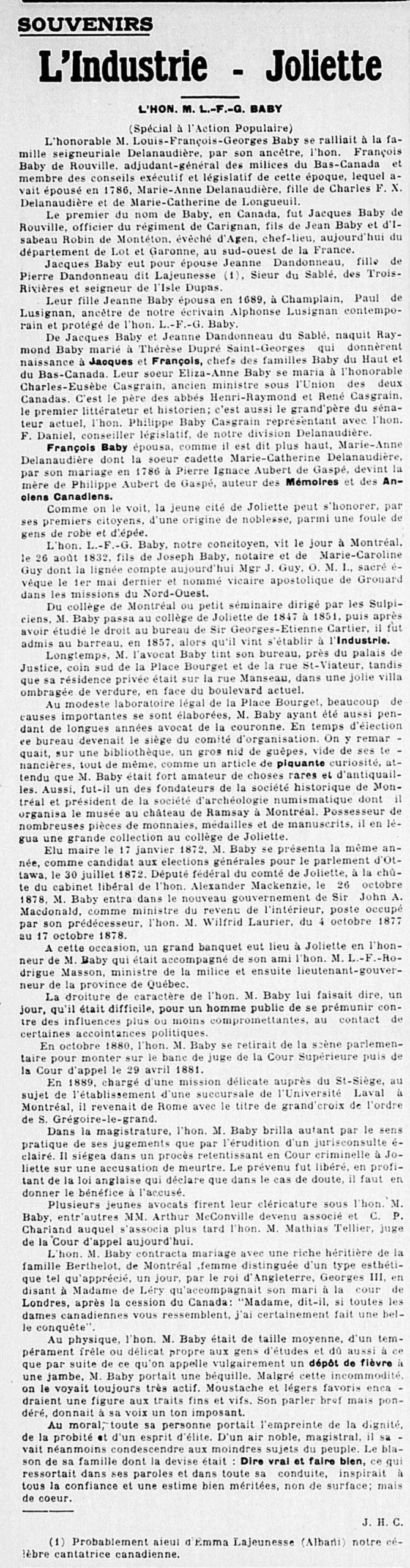 En 1905 l’Honorable Louis-François-Georges Baby ancien maire de Joliette, ministre fédéral et juge à la Cour Supérieure a rédigé son testament chez son notaire à Joliette. Il y a fait de nombreux dons à sa famille et à des communautés religieuses. Il a surtout lègué à l’Université Laval de Montréal une précieuse collection de documents sur l’histoire du Canada, et au Collège de Joliette une partie de sa bibliothèque. Il avait été un des fondateurs de la société historique de Montréal et du musée du château Ramezay, un collectionneur et un mécène.