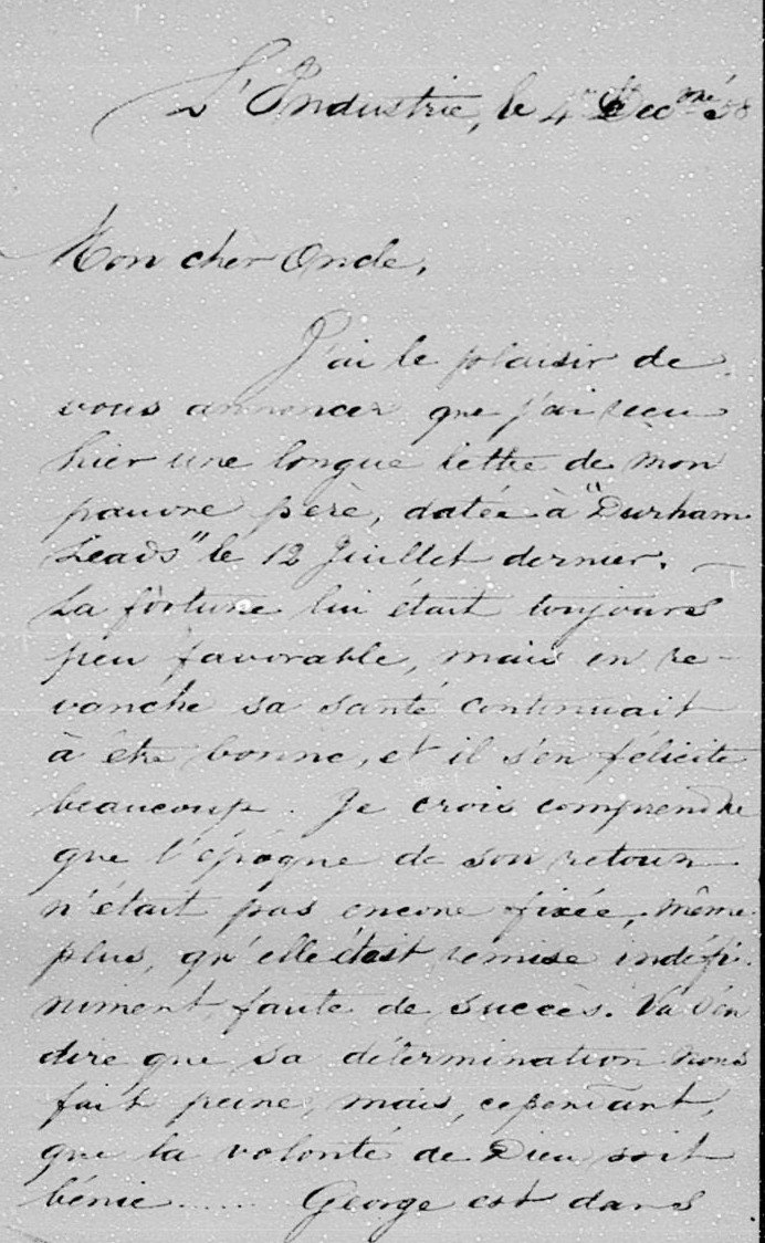 Dans cette lettre à son oncle (?) datée de L’Industrie 4 décembre 1858 G. Baby donne des nouvelles de son pauvre père vivant à Durham Leads à qui la fortune était peu favorable. Il semble que celui-ci souffrant d’une dépendance à l’alcool avait dilapidé la fortune familiale.