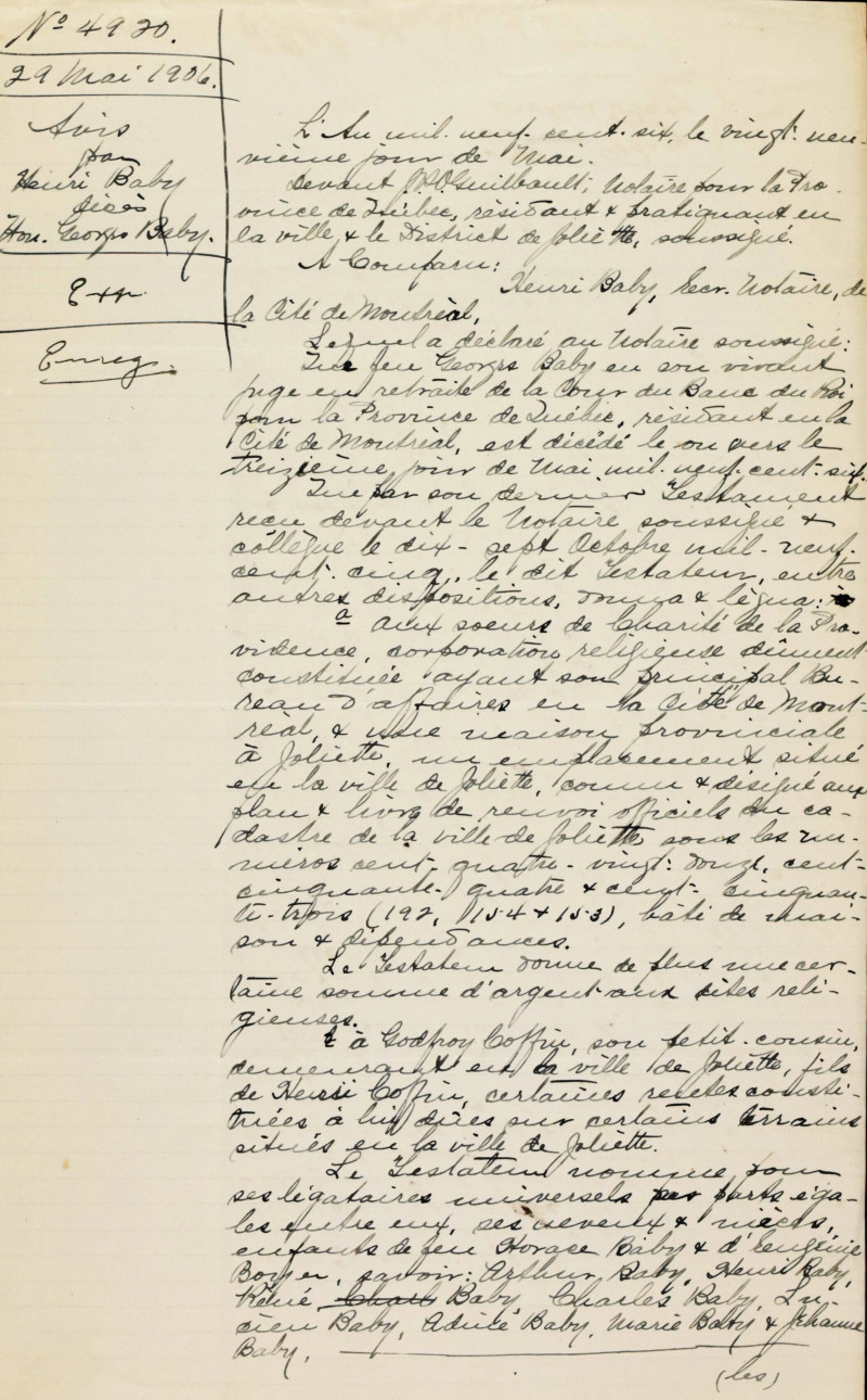 Le 29 mai 1906 Henri Baby notaire de Montréal a fait notarié l’avis du décès de Georges Baby. Il résume quelques articles du testament, le legs aux soeurs de la Providence des lots 192, 154 et 153 de Joliette avec maison et dépendances plus une somme d’argent; à Godfroy Coffin son petit-cousin des rentes constituée sur des terrains de Joliette. Ses légataires universels par parts égales Arthur, Henri, René, Charles, Lucien, Adine, Marie et Johanne. Ses exécuteurs testamentaires étaient Henri Baby notaire de Montréal et Arthur Baby comptable de Winnipeg.