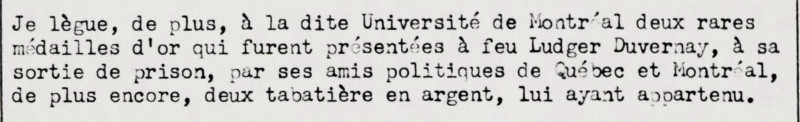Je donne et lègue à l’Université Laval à Montréal toute ma bibliothèque historique composée d’ouvrages Canadiens ou traitant sur le Canada en particulier ou sur l’Amérique en général. Comme cette collection de livres souvent très connus est d’un grand prix, j’impose à cette donation la construction d’un édifice à l’épreuve du feu pour recevoir ces livres.