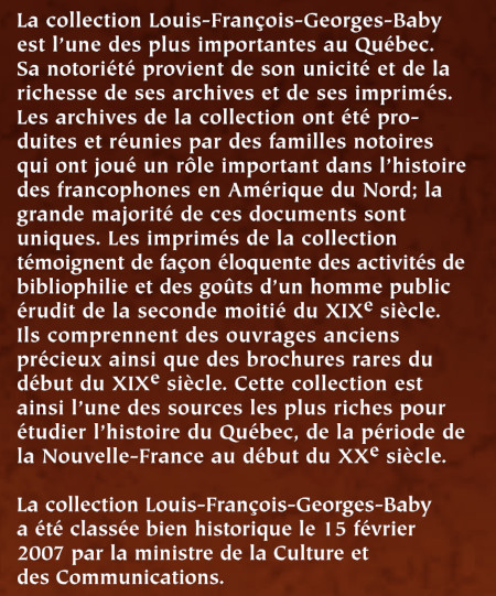 Au final, l’Université de Montréal semble avoir conservé la plupart des titres contenus dans le catalogue. Ils sont simplement non liés à la Collection. Et dans ce cas de figure se retrouvent nombre de brochures non reliées, des documents officiels et les périodiques canadiens qu’avait pu rassembler le juge Baby. Manquent aussi à la Collection les titres qui relèvent de la littérature canadienne, ainsi que de la littérature scientifique. On aurait malencontreusement réduit la Collection Baby à sa seule portion de nature spécifiquement historique. On le constate, Louis-François-Georges Baby avait une conception très large de sa bibliothèque historique ou canadienne, tendant à y faire entrer tout ce qui se publiait au pays comme source d’information utile.