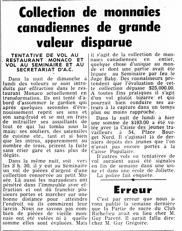 En cherchant dans les archives des journaux j’ai trouvé cet article rapportant le vol en avril 1961.