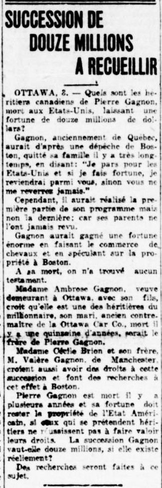 En 1922 c’est au tour des héritiers de Pierre Gagnon, mort à Boston en laissant une fortune de 12 millions, de tenter leur chance. À la même époque les héritiers de Gilbert Gagnon s’unissent pour entamer une poursuite de 22 millions contre un certain J.-L. Giroux en contribuant à un fonds collectif de plus de 100.000$. Une autre famille, celle d’Éloi Gagnon, pense qu’un certain A. Gagnon mort millionnaire est leur parent mais qu’il y a une erreur de prononciation (A ou E, en anglais il peut y avoir erreur!).