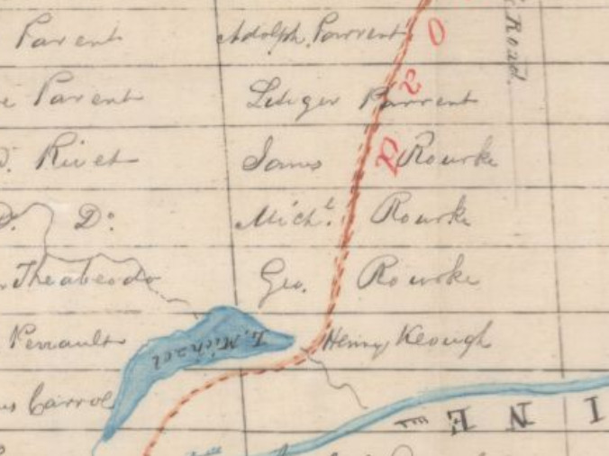 En fait James, Michael et George Rourke ont acquis les lots 12, 13 et 14 du 6ème rang de Chertsey selon le plan paru en 186?, sur d’autres plans le nom est Rock. Il s’agit d’une famille de Rawdon qui n’était pas d’origine amérindienne.