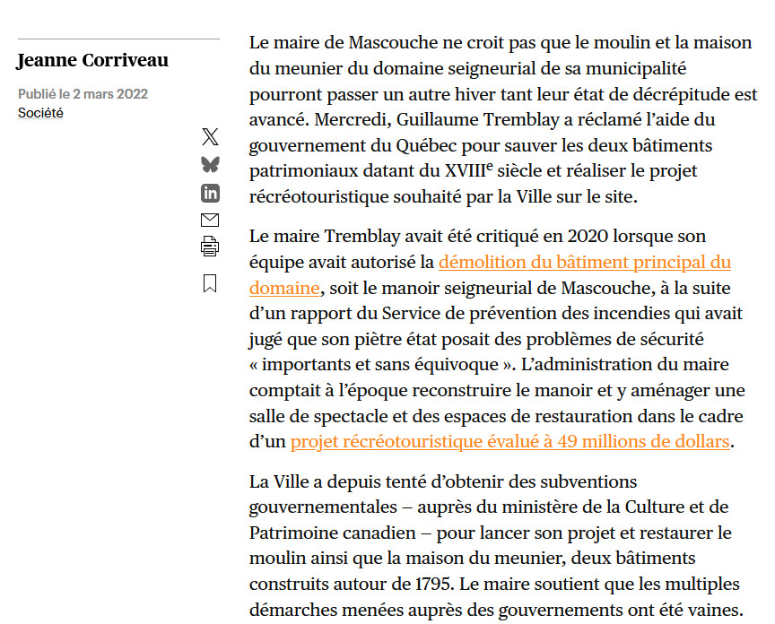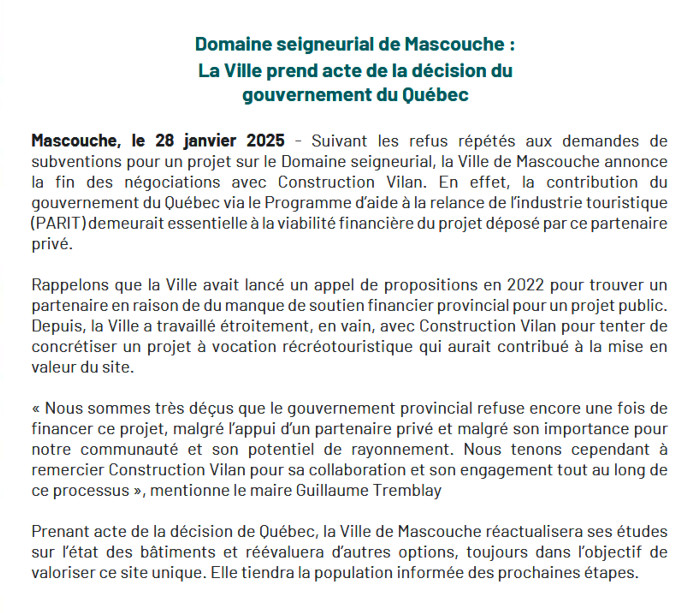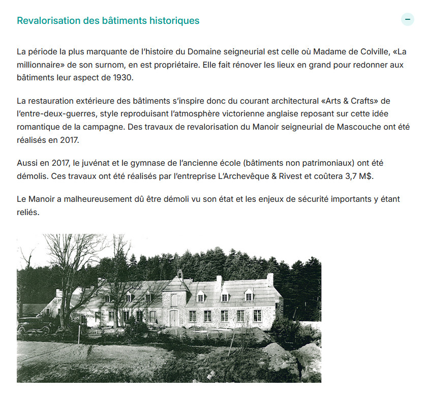 En 2025 le site annonce: Suivant les refus répétés aux demandes de subventions pour un projet, autant public que privé, sur le Domaine seigneurial, la Ville de Mascouche réactualisera ses études sur l’état des bâtiments et réévaluera d’autres options, toujours dans l’objectif de valoriser ce site unique. Mais il n’y a plus de bâtiments à valoriser si je comprends bien. D’ailleurs un communiqué de presse du 28 janvier 2025 annonce l’abandon du projet récréo-touristique.