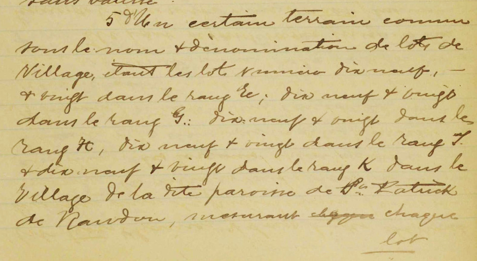 15 janvier 1825 – Vente par Thomas Wallace tonnelier à Rawdon et Barbara Robinson à Philemon Dugas de la moitié du lot 22 du 2ème rang tenant par devant à Margaret Sawer, par derrière à John McColler(?), sur les côtés à Andrew Smart et aux vendeurs pour 12 livres et 10 shillings; Martin S. Parker et Louis Piquette capitaine ont servi d’interprètes.