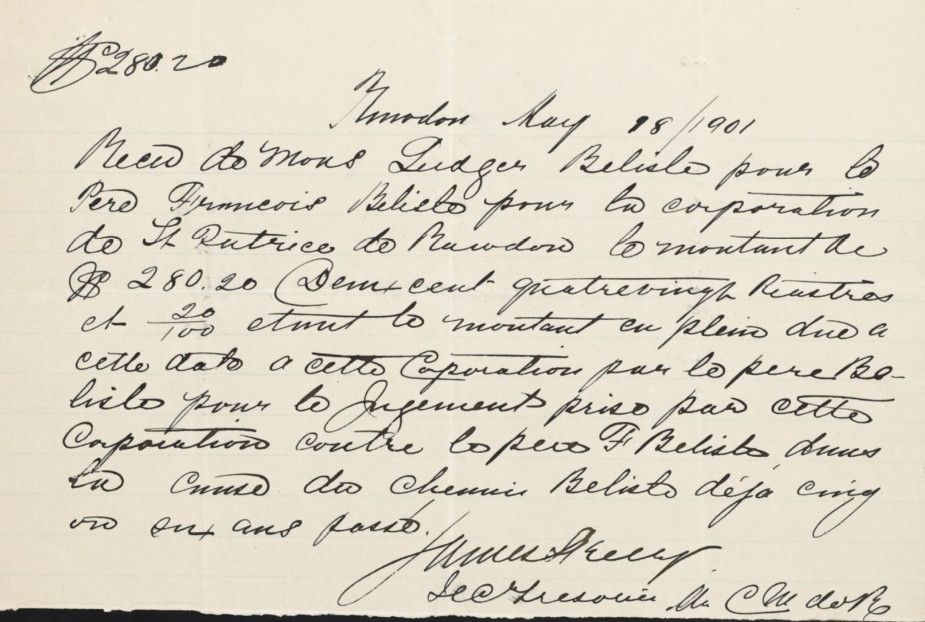 20 août 1914 – Convention entre John H. Daly et le révérend Joseph Alcide Dufort pour ouvrir un chemin parallèle à la rue Queen pour faire communiquer la rue St-Patrick avec le chemin conduisant à la chute à Magnan sur le lot 17b-6.
