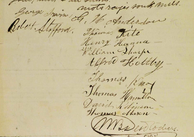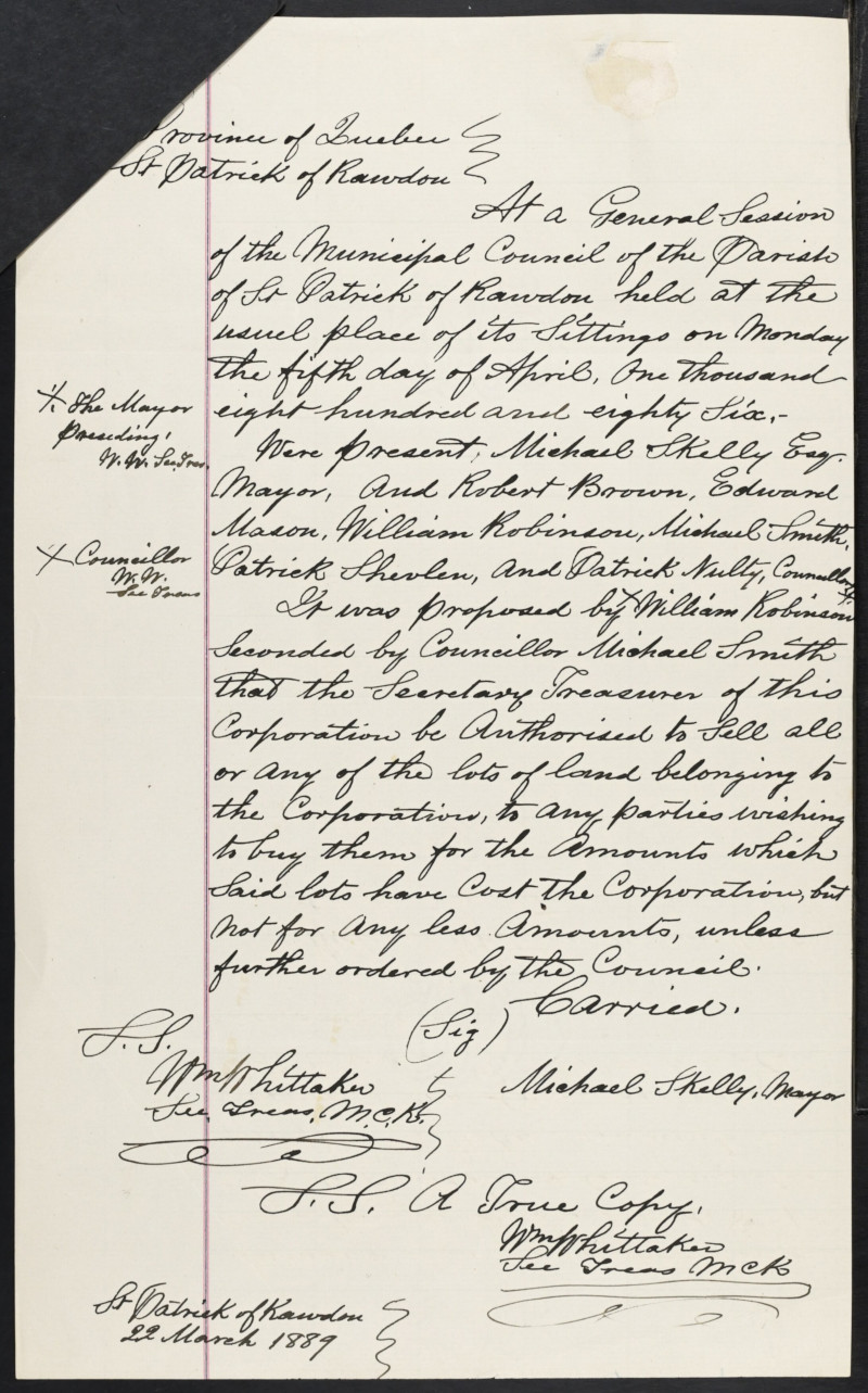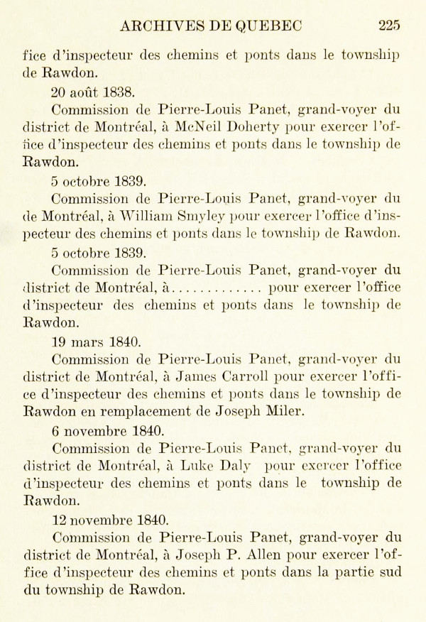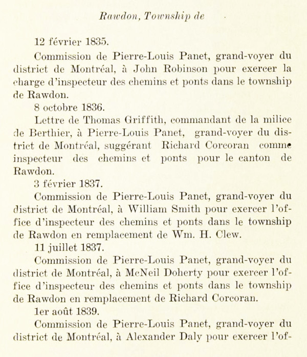 26 décembre 1829 – Dépôt d’acte d’assemblée par Roderick McKenzie écuyer et Alexandre Connely de Rawdon afin de nommer et établir des syndics pour l’établissement des écoles dans le Township de Rawdon conformément à l’acte passé à la dernière session du Parlement; ont signé John Robinson, Thomas Lane, Patrick Casaday, Conely Casaday, James Cahill, Thomas Mitchell, James Robinson, Andrew Irwin, George Pollock(?), Owen McDermott (marque), William Robinson, Thomas Robinson, William Cole, Alexander Connoly, John Burns.