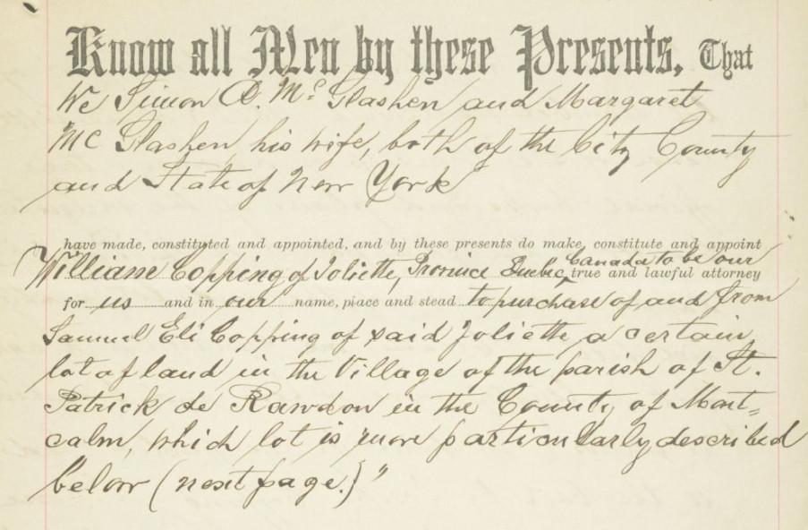 16 octobre 1827 – Vente par Matthew McColley à William Steel agriculteurs de Rawdon d’un terrain du lot 22 du 3ème rang de 9 arpents par 8 contenant 50 arpents avec une maison et une grange, tenant par un bout au vendeur, de l’autre au cordon du 4ème rang, bordé par John Burns et James Car, 8 arpents défrichés pour 660 livres. Zacharie Cloutier gendre et voisin de F. Dugas a servi d’interprète.