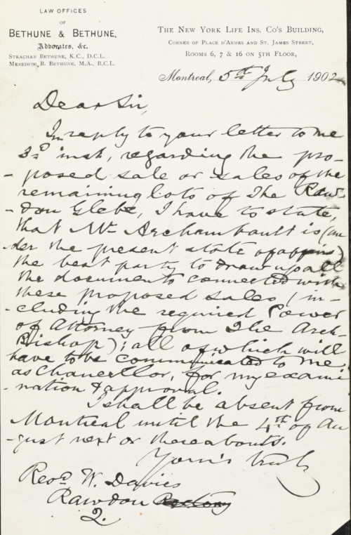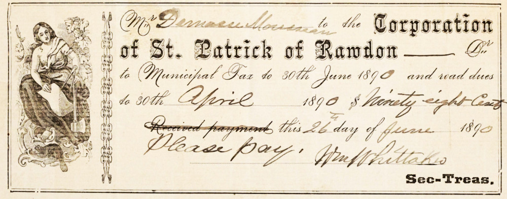 18 juillet 1907 – John H. Daly a vendu de nombreux terrains dans le village de Rawdon mais beaucoup moins que Hermine Jobin; les ventes mentionnent des terrains bordés par les rues Queen, St-Germain, St-John, St-Jean-Baptiste. Une autre vente à Edward Rowan mentionne The Commissioners street projetée.