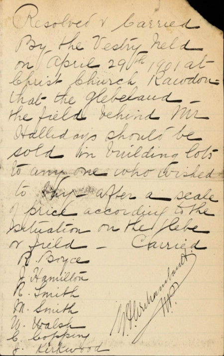 4 juillet 1907 – Sale by Christ Church to reverend William Davies d’une partie du 18o-5 tenant au chemin menant à la rivière Rouge, des terrains appartenant au parsonage et à Frank Morgan avec une maison et une grange. William Davies a fait donation de ce terrain le même jour à Louisa Kite veuve de Thomas Copping pour le bénéfice de Rosa Alice Gray épouse de George Morgan.