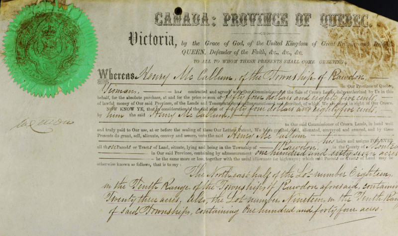 Le premier acte notarié mentionnant des cultivateurs à Rawdon date de 1821 et il concerne une vente de bois et de patates.