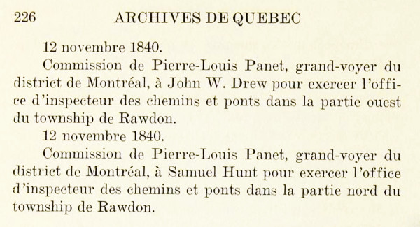 Un rapport sur les terres de la couronne daté de 1821 montre que le township de Rawdon n’était pas encore habité car les habitants ne savaient pas à qui s’adresser pour obtenir des titres de propriété. Mr. Antrobus ne possède aucun titre de ce Township, quoiqu’il en soit en possession et qu’il loue des Sucreries considérables dans ce Township. Les Terres de ce Township sont très propres à la culture, surtout aux environs des lacs qui se trouvent dans le Township; aucune partie n’en est encore habitée. [Il semble que Jacques Deligny ait confondu les townships de Rawdon et Brandon; J. Antrobus n’a rien à voir avec Rawdon].