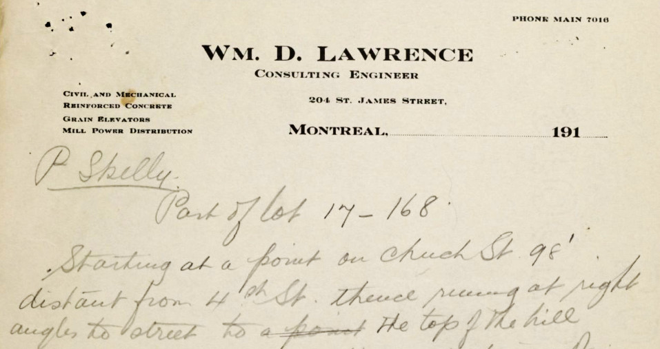 14 février 1913 – Sale by Peter Skelly to James Williamson Ross agent de la ville de Westmount d’une partie de 19-6, de 18b-6 et un chemin pour $8.000. Le plan annexé à l’acte montre les rues St-Patrice et Metcalfe, le chemin vendu et la partie du lac artificiel projeté. Le même jour il a vendu la subdivision 168 du lot 17 du 5ème rang sur Church street pour $1 et autres considérations.