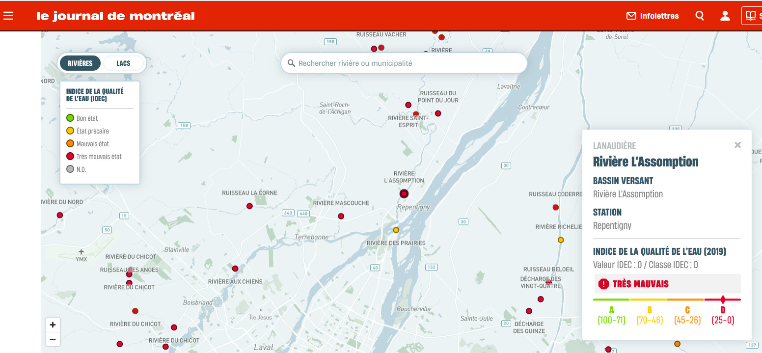 Le 25 juillet 2025 le Journal de Montréal a publié une étude sur la qualité de l’eau des lacs et des rivières au Québec. L’indice pour la rivière de l’Assomption (2019) à la station de Repentigny était jugé très mauvais. Plus en amont à Joliette il était jugé mauvais et à St-Côme bon.