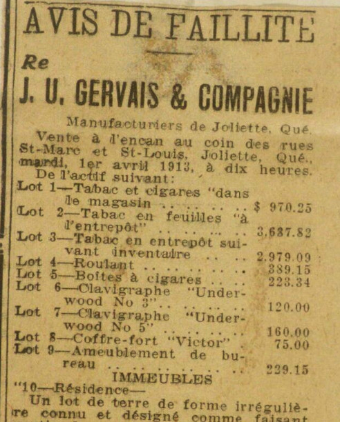 À Joliette aussi plusieurs manufactures de tabac se sont succédées après 1900. La manufacture de tabac et cigares de Joliette J.U. Gervais et Cie a fait faillite en 1913 et ses propriétés ont été vendues: le lot 90/22 sur la rue St-Louis avec les bâtisses, machineries et outillages et le lot 400 sur la rue de Lanaudière avec les bâtisses. Le tout a été adjugé à J. Ad. Renaud pour $7.000.