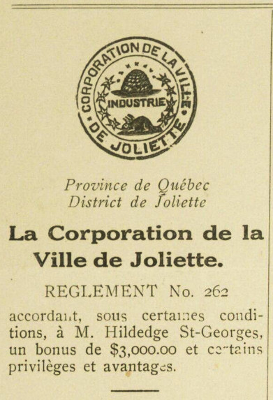 Le 4 mars 1916 la Corporation de la ville de Joliette a adopté le règlement 262 pour accorder certains privilèges à Hildedge St-Georges qui voulait établir une manufacture pour la préparation des tabacs à cigares et cigarettes et pour la fabrication des cigares: un bonus de $3.000, une exemption de taxes, un tarif d’électricité réduit, etc.