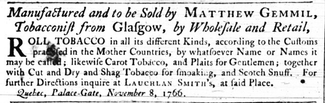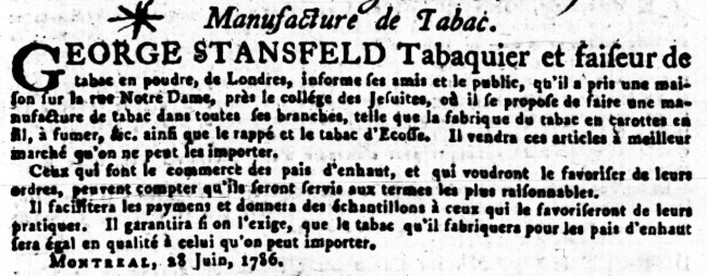 George Stansfeld tabaquier et faiseur de tabac en poudre, de Londres, informe qu’il a pris une maison sur la rue Notre-Dame (à Montréal) où il se propose de faire une manufacture de tabac dans toutes ses branches, telle que la fabrique de tabac en carottes en fil(?), à fumer, etc. ainsi que le rappé et le tabac d’Ecosse.