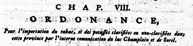En 1787 le gouverneur a promulgué une ordonance pour taxer l’importation du tabac et de la potasse clarifiée arrivant du lac Champlain par Sorel. Le tabac américain de Virginie était le plus réputé.