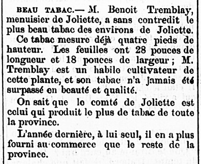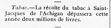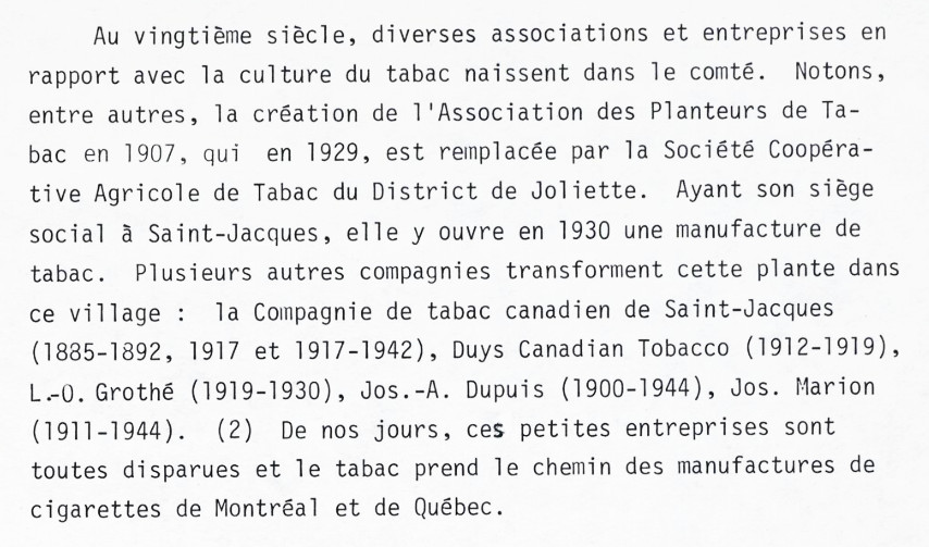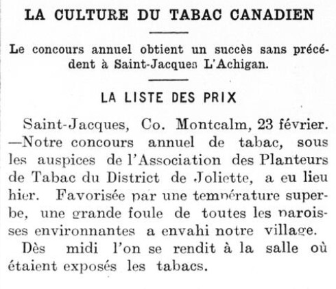 Suivant l’exemple de Saint-Jacques toute la région de Lanaudière s’était mise à la culture du tabac. On sait que le comté de Joliette est celui qui produit le plus de tabac de toute la province.