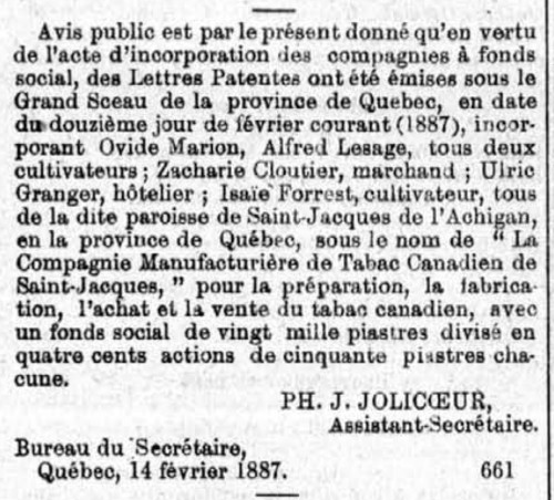 La compagnie a été incorporée en 1887 sous le nom de Compagnie Manufacturière de Tabac Canadien de St-Jacques. Ses premiers administrateurs étaient Ovide Marion et Alfred Lesage cultivateurs, Zacharie Cloutier marchand, Ulric Granger hôtelier, Isaie Forest cultivateur.