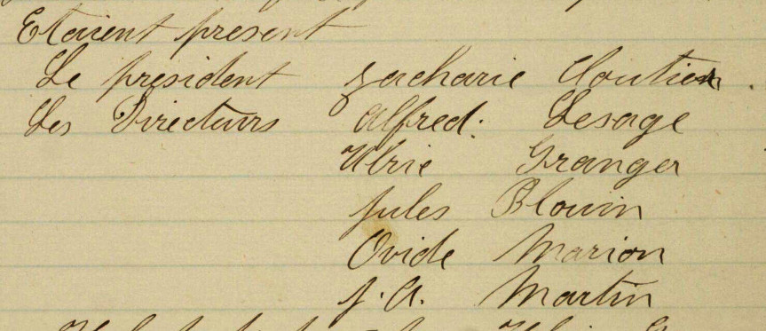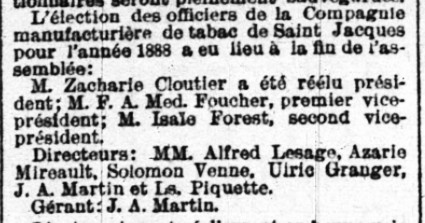 En 1888 M. F. A. Med. Foucher a été élu premier vice-président de la compagnie; Azarie Mireault, Solomon Venne, J. A. Martin (gérant) et Louis Piquette directeurs.
