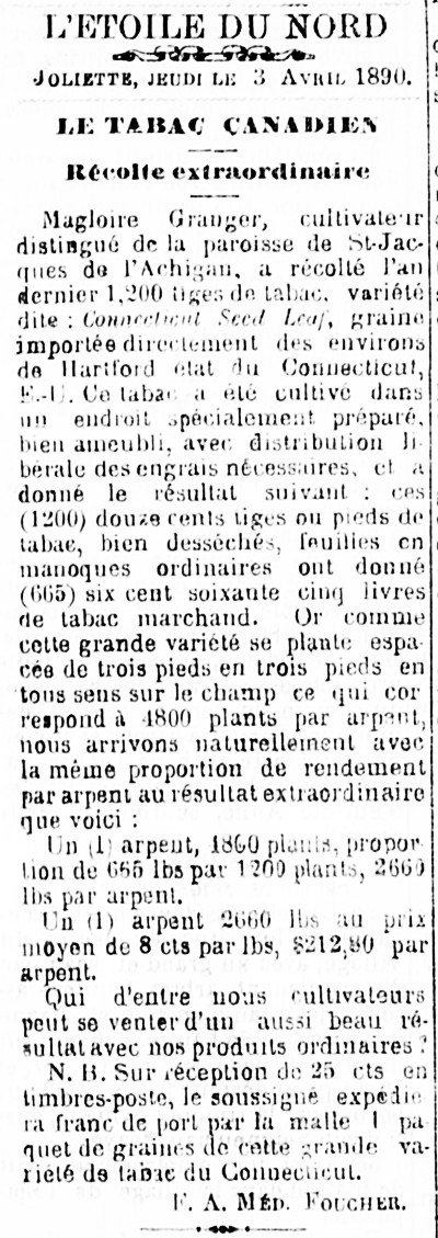 Le 3 avril 1890 le journal de Joliette L’Étoile du Nord a publié un article signé F. A. Med. Foucher. Magloire Granger de Saint-Jacques avait récolté 1.200 tiges de tabac variété dite Connecticut Seed Leaf qui lui avaient donné un rendement record de $212,80 par arpent.