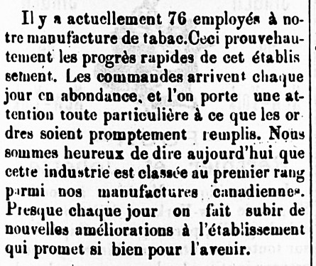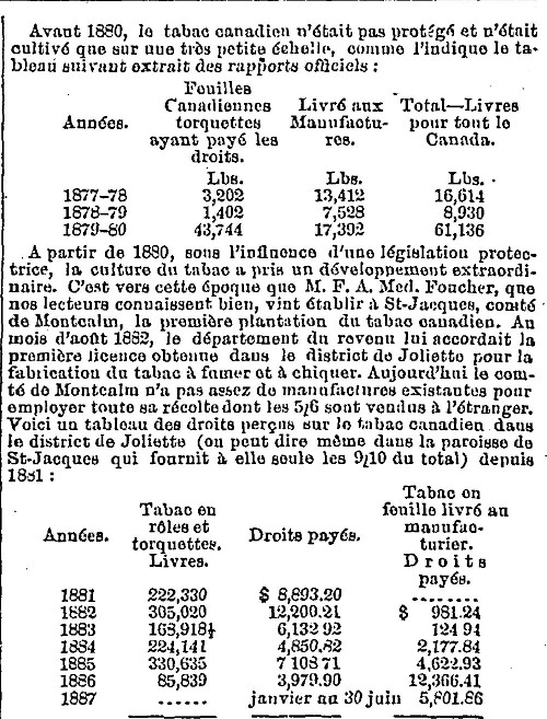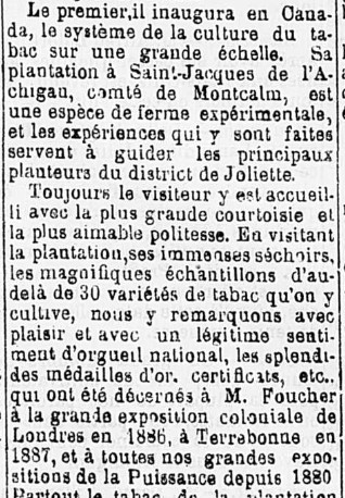 Le travail de promotion de la culture du tabac par F. A. Med. Foucher est souligné dans cet article. Au mois d’août 1882, le département du revenu lui accordait la première license obtenue dans le district de Joliette pour la fabrication du tabac à fumer et à chiquer…