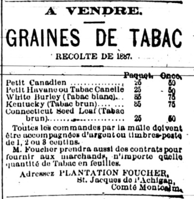 La Plantation Foucher de St-Jacques de l’Achigan annonçait ses graines de tabac dans les journaux: Petit Canadien, Petit Havane ou Tabac Canelle, White Burley (Tabac blanc), Kentucky (Tabac brun), Connecticut Seed Leaf (Tabac brun).