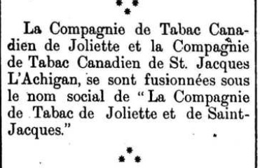 En 1892 la Compagnie de Tabac Canadien de Joliette et la Compagnie de Tabac Canadien de St-Jacques ont annoncé leur fusion sous le nom Compagnie de Tabac de Joliette et de Saint-Jacques.