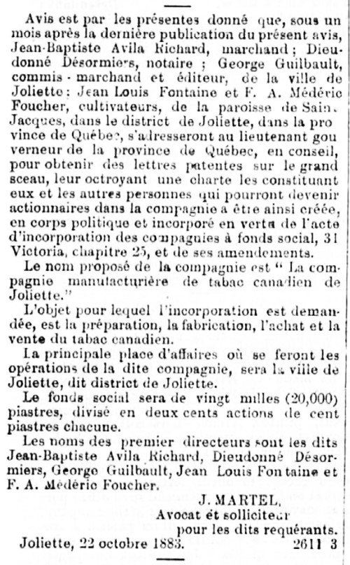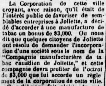 En 1883 la Corporation de la ville de Joliette a accordé un bonus de $3.000 pour la construction d’une manufacture dans la ville. La Compagnie Manufacturière de Tabac Canadien de Joliette a été incorporée.