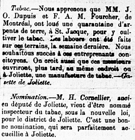 En 1880 Médéric Foucher s’était associé avec Joseph-Odilon Dupuis pour louer une quarantaine d’arpents de terre à St-Jacques pour y cultiver le tabac; les associés projetaient d’ouvrir une manufacture pour la préparation du tabac. M. Hippolite Cornellier ancien député de Joliette avait été nommé inspecteur du tabac pour le district.