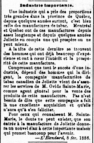 La compagnie a engagé Ovide Sainte-Marie comme agent général pour la vente en 1886 pour assurer la mise en marché de sa production: tabac jaune, tabac noir, tabac haché.