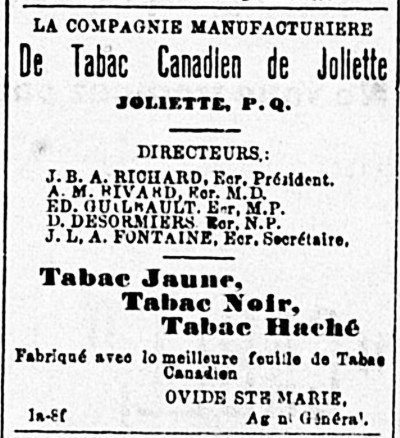 Une manufacture de tabac a ouvert ses portes à Joliette en 1883. Celle de Saint-Jacques continuait ses opérations chez Médéric Foucher; elle était alors la propriété d’Ovide Marion selon l’historique Saint-Jacques une Nouvelle Acadie: