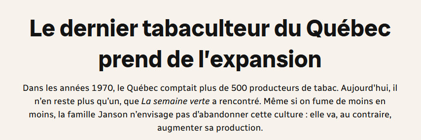 À partir des années 1850 la culture du tabac s’est développée dans la région de Lanaudière qui est devenue la principale productrice du Québec. Depuis toujours le tabac était cultivé par les agriculteurs dans leur potager, ils vendaient une partie de leur production au marché et gardaient le reste pour leur consommation personnelle. Puis la loi les a obligés à vendre leur production à des manufacturiers et des marchands enregistrés et la culture du tabac s’est industrialisée. En 1984 il y avait plus de 300 producteurs dans la région de Lanaudière, en 2026 il n’en reste plus qu’un seul.