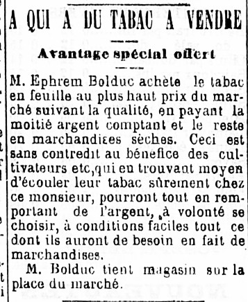 Le 20 mai 1889 Aimé Riopel hotelier et Ephrem Bolduc marchand ont protesté contre Tancrède Gibeau cultivateur de St-Jacques qui leur avait vendu 75.000 livres de tabac de première qualité et 25.000 de tabac en feuille dont la qualité s’était avérée insatisfaisante. Ephrem Bolduc achetait le tabac des cultivateurs moitié en argent et moitié en marchandises à son magasin de la place du marché.