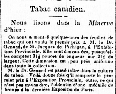 M. le Dr. Genand est passé maître dans la culture du tabac. Voilà douze fois qu’il remporte le premier prix à l’Exposition Provinciale, outre, ce qui n’est pas moins dire, l’obtention d’une médaille de bronze à la dernière Expositon de Paris.