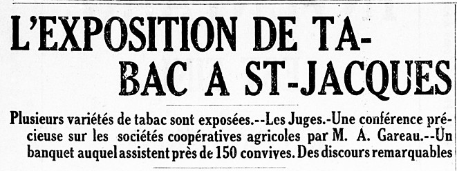 L’exposition de tabac à St-Jacques de 1914 a eu lieu dans la grande salle de la Saint Jacques Tobacco Packing Co. dont le président était Thomas Dufresne. Les classes de produits primés étaient les tabacs Comstock, Connecticut pour la pipe, Général Grant, rouge petit Havane ou autre pour filasse, quesnel, enveloppes à cigares, filasse à cigares, blue Pryor, Belgique et autres tabacs non compris dans les classes précédentes.