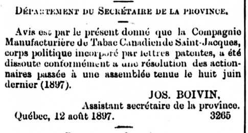 Le neuf novembre mil huit cent quatre-vingt-seize, à une assemblée des actionnaires de la Compagnie Manufacturière de Tabac Canadien de Saint-Jacques… il a été décidé et résolu de liquider volontairement les affaires de la dite compagnie et de dissoudre la dite compagnie, et M. Louis C. Rivard, comptable, de la ville de Joliette, a été dûment nommé liquidateur avec tous les pouvoirs et attributions à lui conférés par la loi dans le but de liquider les affaires de la dite compagnie et de distribuer son actif… (Gazette officielle du Québec, 6 mars 1897).