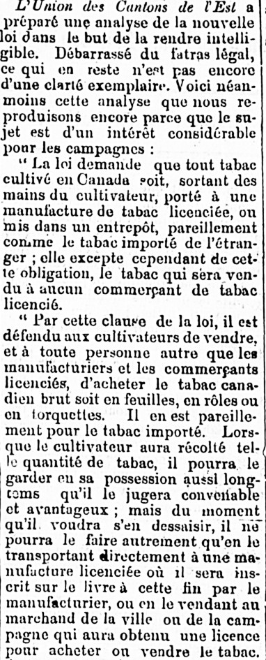 En 1868 la loi sur le commerce du tabac a été amendée. Les cultivateurs se sont vu interdire de vendre leur production au marché, ils devaient la vendre à des manufacturiers ou des marchands enregistrés: le petit commerce du tabac canadien, qui se faisait, sur nos marchés, surtout au protit du cultivateur et pour l’avantage de l’homme du peuple... Le droit sur le tabac canadien est de 5 cenlins par livre, soit en feuilles, en rôles ou en torquettes, celui sur le tabac importé est de 10 centins.