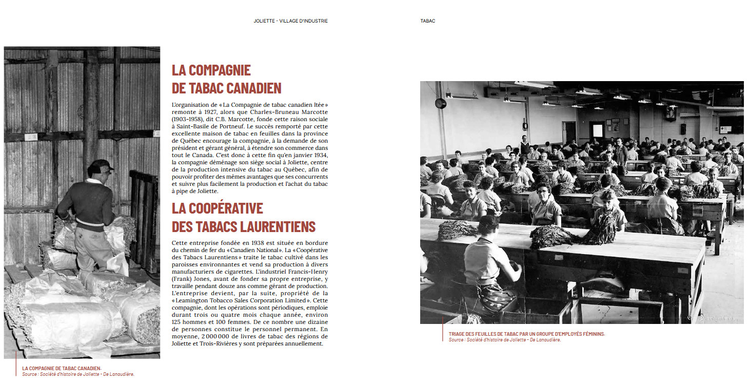 Dans l’inventaire économique du comté de Joliette en 1957 on lit que l’usine de l’Imperial Tobacco au 289 rue Dugas était la plus moderne au Canada. Elle était spécialisée dans le traitement du tabac à cigares et employait 165 femmes et 70 hommes. En 1956 elle avait préparé 3 millions de livres de tabac à cigares, la compagnie avait aussi acheté 3 millions de livres de tabac jaune à cigarettes. L’usine a fermé ses portes en 2000, elle n’employait plus que 74 travailleurs.